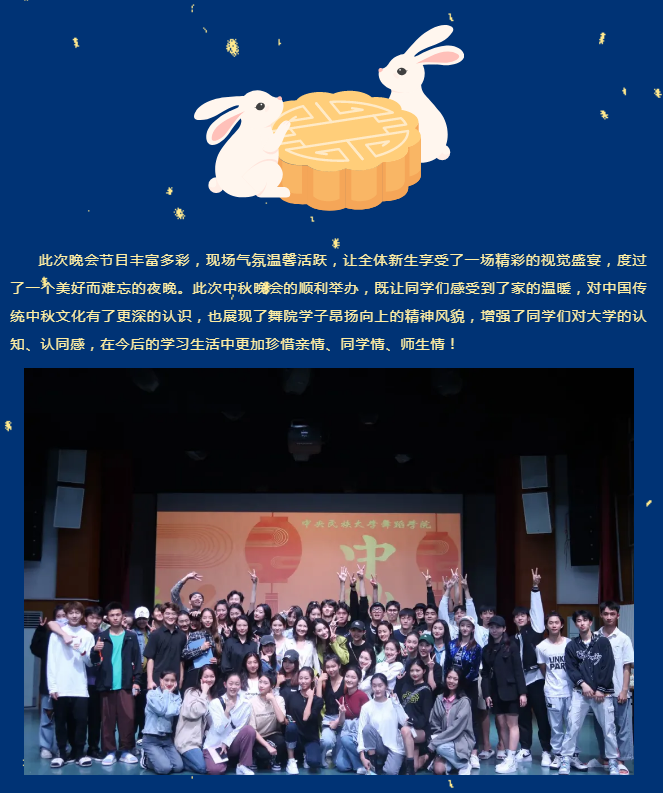为营造温暖的节日气氛,让初入校园的小萌新们更快适应大学生活,缓解思乡怀友之情,9月21日晚,必威BETWAY西汉姆联中秋晚会在小礼堂举行。必威BETWAY西汉姆联党委书记马娟、党委副书记王淼、2021级表演女班班导师潘薇佳、2021级教育女班班导师李美静、必威BETWAY西汉姆联介绍辅导员李飞、2021级本科生辅导员赵子嘉出席晚会。本次晚会由2021级MFA教育必威BETWAY西汉姆联介绍谭欣露和2021级舞蹈表演吴广生主持。