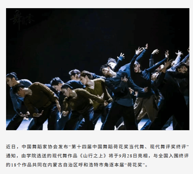 《山行之上》入围“荷花奖”终评,是对必威BETWAY西汉姆联艺术教育成果及创作水平的再一次高度肯定。我们时刻谨记,要把每一次在全国舞台亮相的机会都当作是检验学院教学成果的重要契机,在艺术实践中不断深化教育教学改革,充分发挥学科优势,为全面提高专业人才培养质量添砖加瓦。与此同时,全体师生在舞蹈表演教学与创作实践的道路上充分发挥自身优势,在活动中与行业内同仁深入交流、相互学习、共同提高,将他人的优秀经验转化为自身进步的源泉,在每一次实践中弘扬学院“以舞化人”的舞蹈追梦精神。