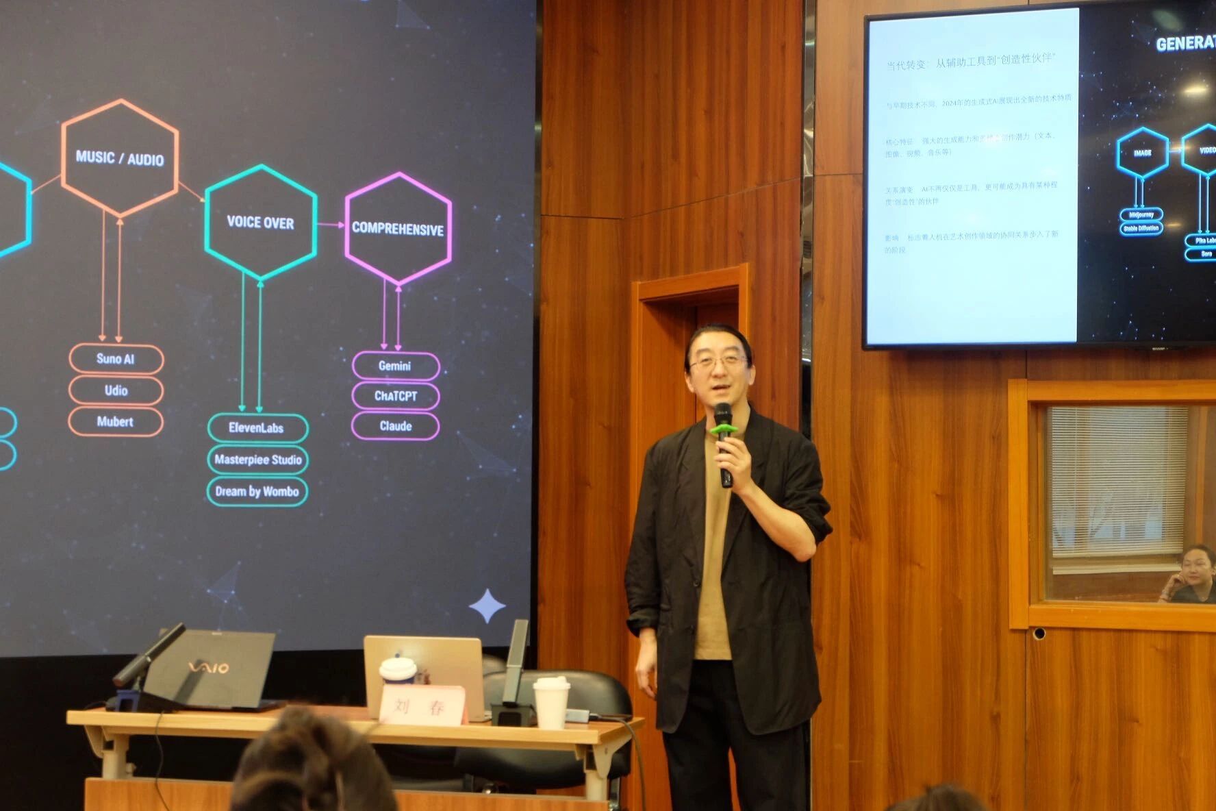 刘春副研究员在讲座开篇提出:“舞蹈是否需要人工智能?”这似乎是在重启技术革新和艺术表达的古老对话。事实上,这种对话从未中断,此次“AI革命”不过是又一次的边界探险。在数字技术深度重塑人类文明形态的当下,生成式人工智能(Generative Artificial Intelligence)作为前沿科技革命,正以颠覆性力量冲击着传统艺术创作领域。讲座中,刘春带领大家审视和梳理了人工智能引入舞蹈领域的历史演进,揭示舞蹈艺术家如何持续借助新兴技术拓宽身体表达的边界,并列举了相关例证。同时,刘春还列举出了当下可用于舞蹈领域的生成式AI工具,丰富了师生们的知识储备及播放了收集的案例视频。