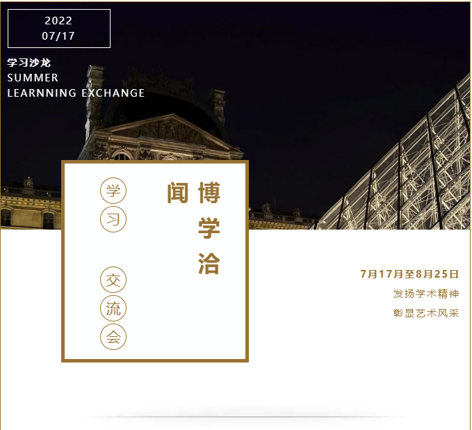 为充实必威BETWAY西汉姆联同学们假期学习生活,并给予线上自主学习的消化提供良好支撑,必威BETWAY西汉姆联必威BETWAY西汉姆联介绍会学术部特联合团委宣传部举办了“博学洽闻”交流会之暑期学习沙龙,旨在为同学们提供良好的居家自习空间,利用假期时间提高自身知识技能,发扬学术精神,彰显艺术风采。