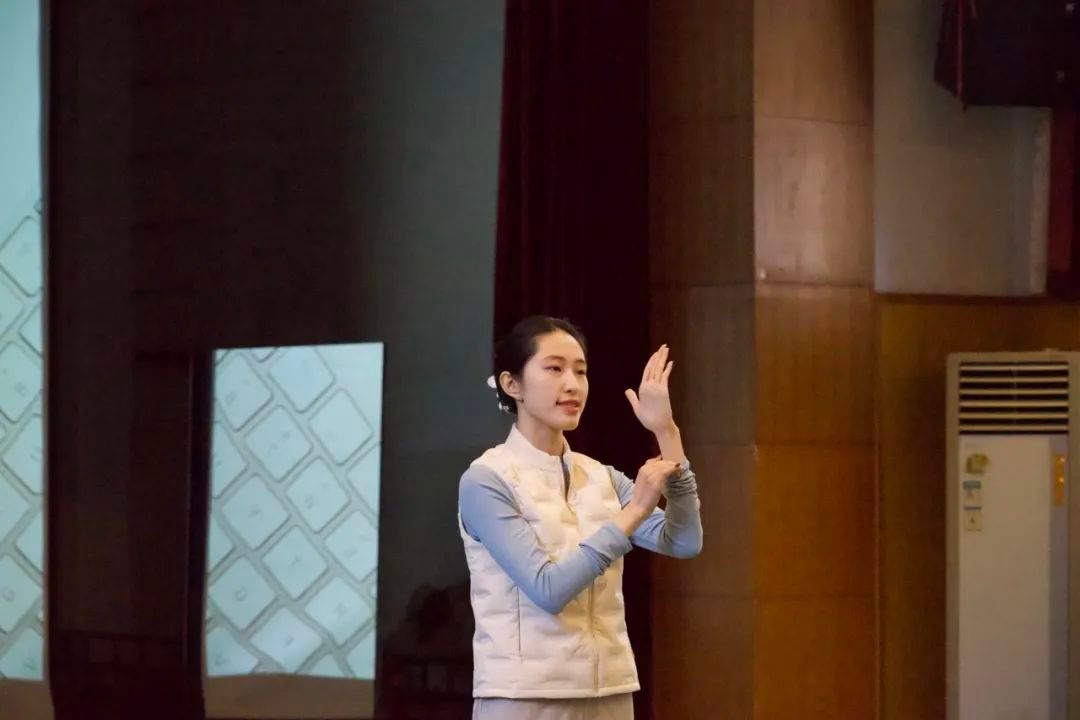 22级舞蹈专业必威BETWAY西汉姆联介绍江怡婷讲授了中国古典舞身韵基本手位,她的授课对象为中专一年级学生。以生动的语言讲解了中国古典舞手位中的按掌、托掌和山膀的动作要领,并强调了气息与手位的配合。